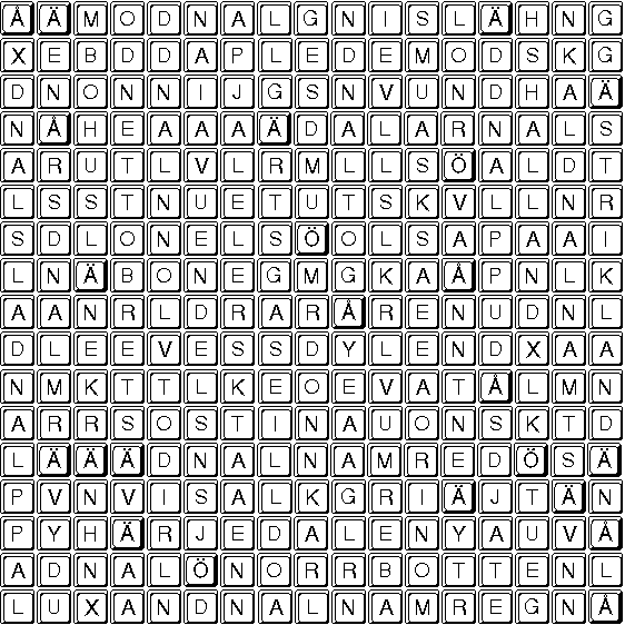 I rutan nedanför finns alla svenska landskap inskrivna. De står vågrätt och lodrätt samt baklänges eller framlänges. Dessutom diagonalt! Om du kan fler eller vill diskutera lösningen så skicka mail! |